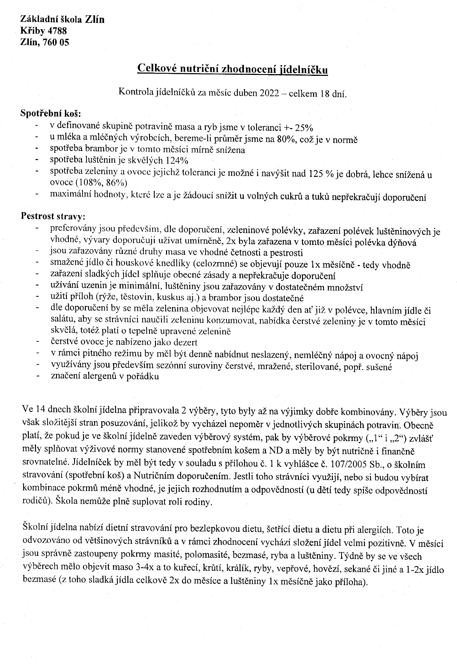 Hodnocení jídelníčku naší školy nutričním terapeutem