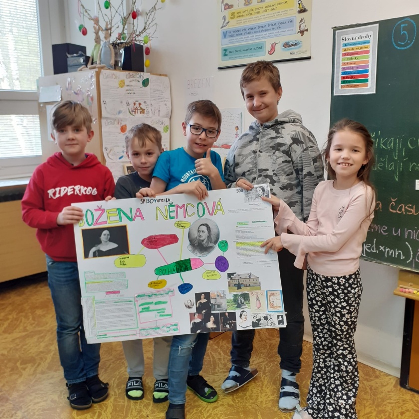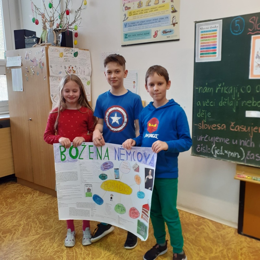 Protože u žáků podporujeme rozvoj digitálních kompetencí, tak si žáci zkoušeli z internetových zdrojů sami ve skupinách vyhledat informace o životě a díle B. Němcové. Z těchto informací žáci tvořili informační plakáty a hlavně museli celou svoji aktivitu odprezentovat zpaměti před ostatními jako skuteční „moderátoři“.