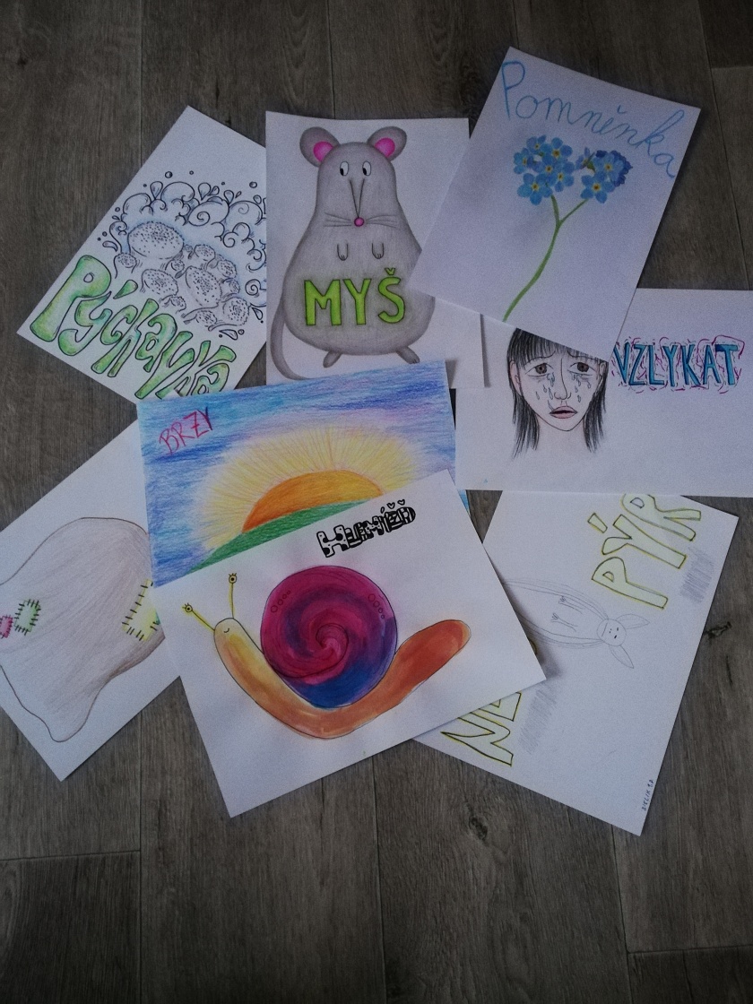 Výtvarnou výchovu jsme si s žáky 7. C a 9. B propojili s českým pravopisem. Úkolem bylo vytvořit výkres, na kterém bude ztvárněn gramatický jev. Mohli si libovolně vybrat, na kterou problematiku se zaměří. Nejčastěji se objevovala vyjmenovaná slova, psaní bě/bje, mě/mně. Žáci si tak mohli češtinu opakovat méně obvyklým způsobem. Někteří stihli, dokonce vyrobit i více slov. V hodinách panovala poklidná atmosféra.