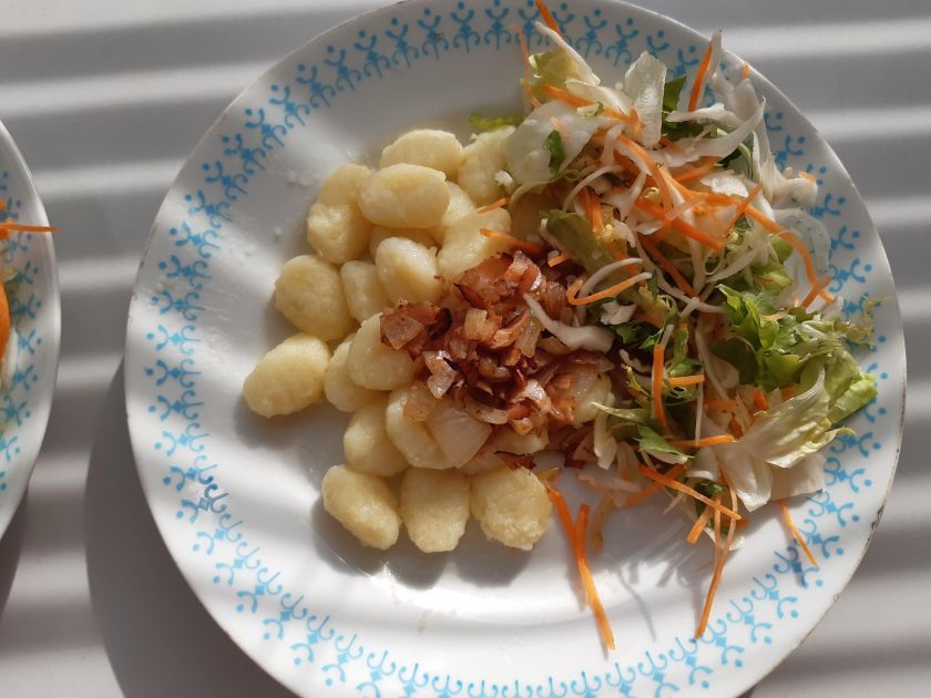 Postup: Prosejeme mouku, přidáme vejce, sodu, měkké máslo, sůl, pepř a vypracujeme těsto, dobře uhněteme a necháme 15 min. odpočinout. Těsto vyválíme do válce (šíře klobásy) a nakrájíme na stejně velké kousky, které vaříme v osolené vodě asi 7 minut. Uvařené, okapané kousky dáme na talíř a přelijeme směsí, kterou jsme si před tím připravili: na kostičky nakrájenou cibuli a slaninu osmahneme dozlatova. Další variantou je místo slaniny použít uvařené kuřecí maso, které osmahneme spolu s posekaným česnekem, solí, pepřem, dáme do mísy s uvařenými kousky a přidáme zakysanou smetanu, promícháme a podáváme.