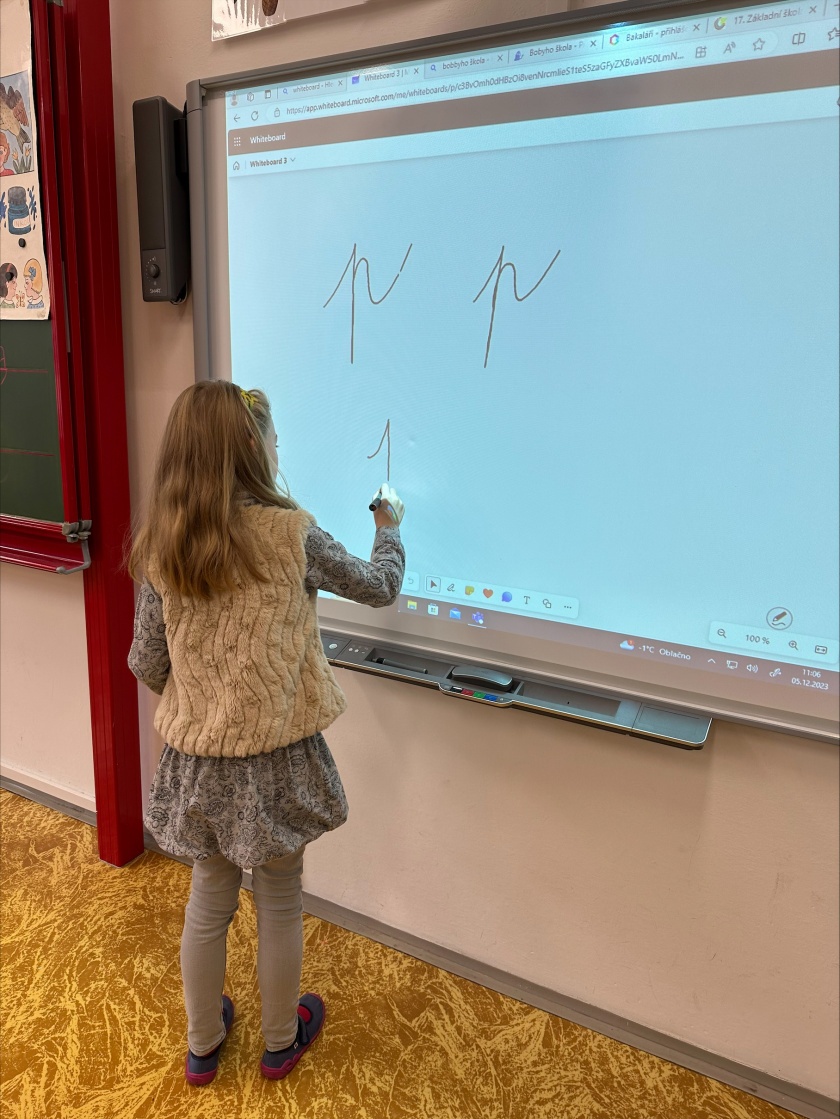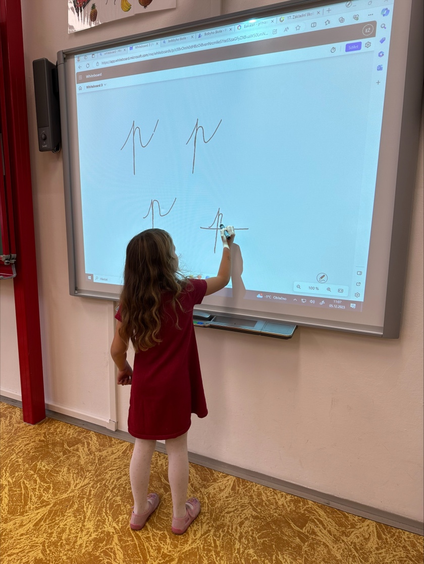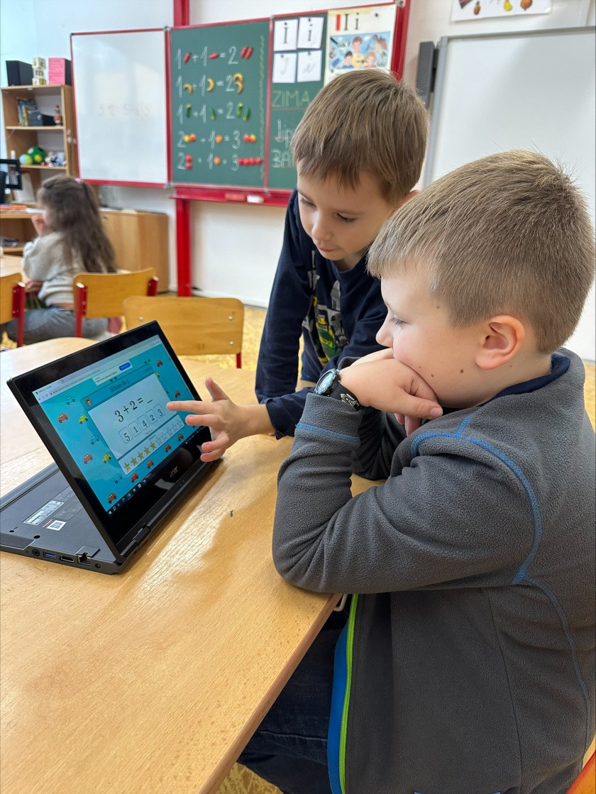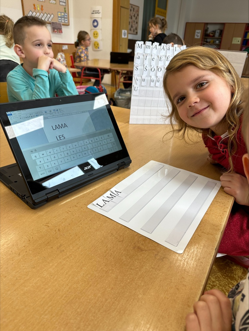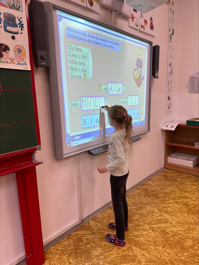 V prvním ročníku začínáme s rozvojem digitálních kompetencí. Vyučování si zpestřujeme využíváním interaktivní tabule, kde se děti mimo jiné mohou věnovat uvolňovacím cvikům a procvičení psaní jednotlivých písmen. Dále jsme do výuky zkusili zařadit také tablety. Děti si na nich mohly zopakovat učivo a procvičovat skládání slov. To si nejdříve zkusily zapsat na klávesnici do tabletu, a nakonec si ho poskládat z naší skládací abecedy.