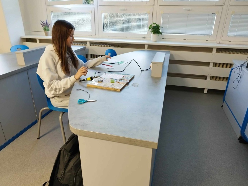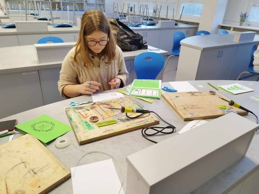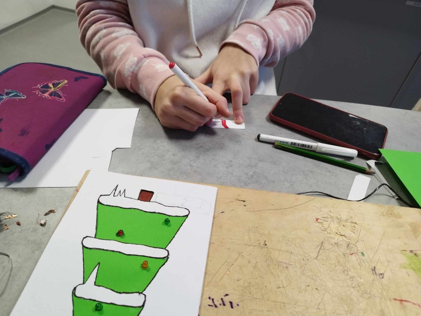 Před Vánoci, a ještě první týden v lednu panovaly finální úpravy žáků na jejich dílech. Vánoční přání s paralelním zapojením diod se dokončila a žáci odcházeli spokojení se svými výtvory! Pro velký zájem o dílny po jarních prázdninách začne blok nových dílen – tentokrát však nebudeme dělat stromeček, ale žáci si mohou vybrat mezi vajíčkem, dýní či kostlivcem!