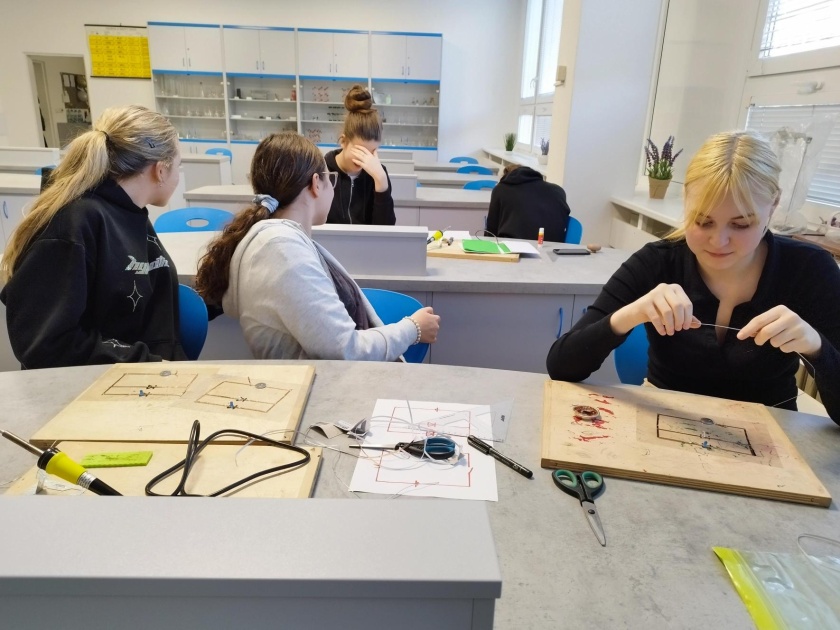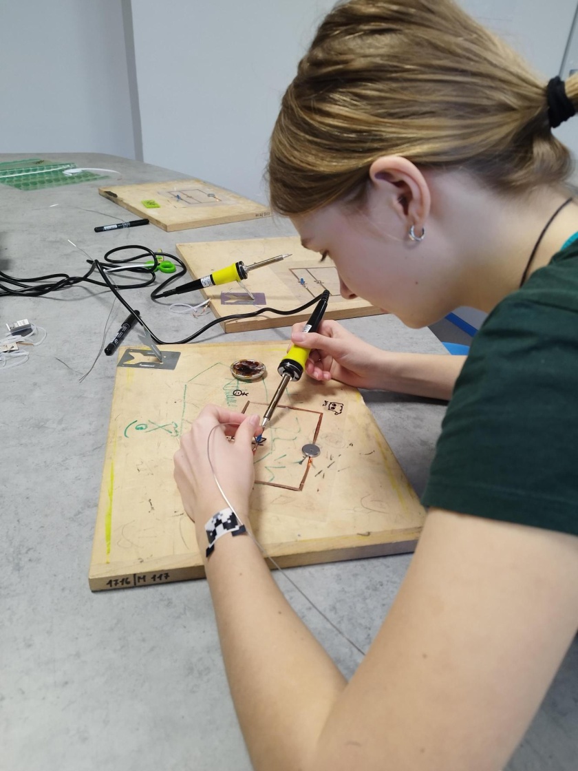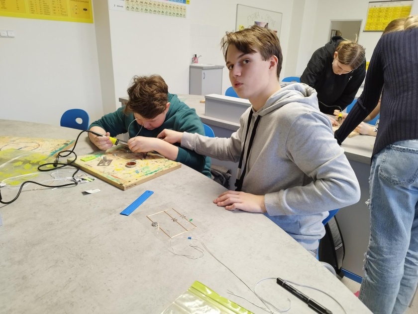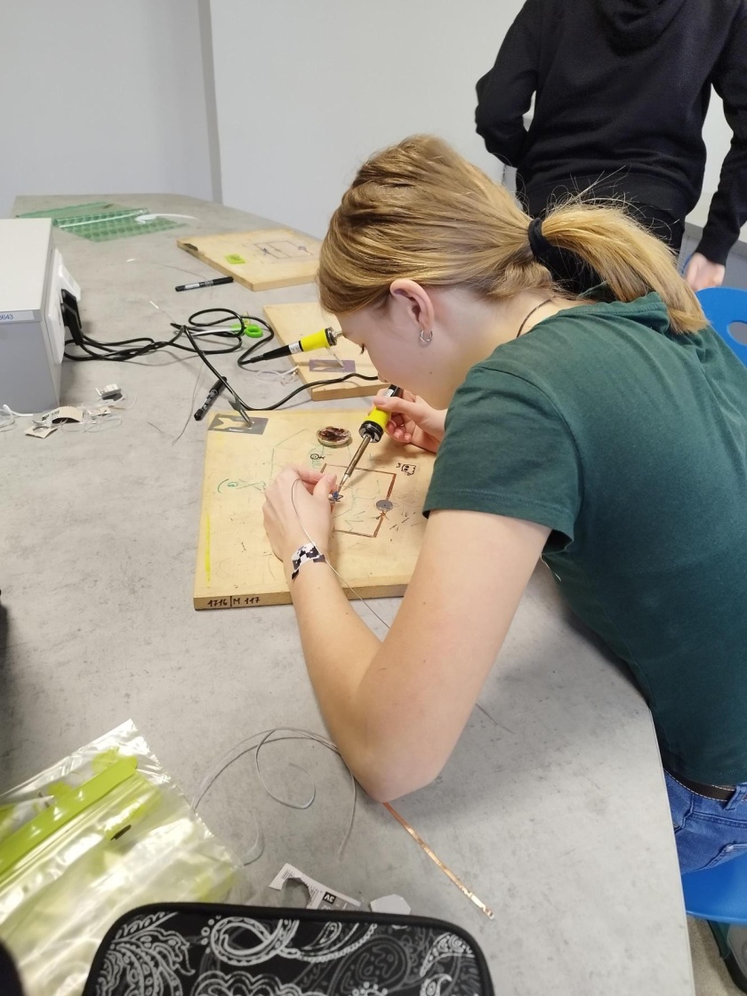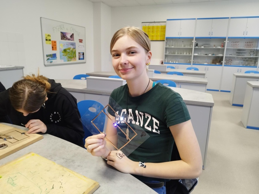 Pro velký zájem žáků jsme rozjeli na škole i druhé dílny placaté fyziky, kde jsme s minulou skupinkou dělali vánoční stromeček s diodami. Tentokrát nás čeká halloweenské téma. Momentálně máme za sebou tři setkání, kde jsme se naučili ovládat pájku a sestavili si jeden dva jednoduché obvody. Všichni jsme svítili! Máme to šikovné děti! A po posledních dílnách vás budeme určitě informovat, co jsme zvládli udělat za finální výtvor!