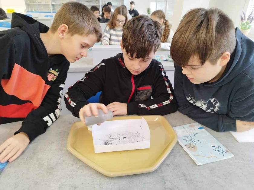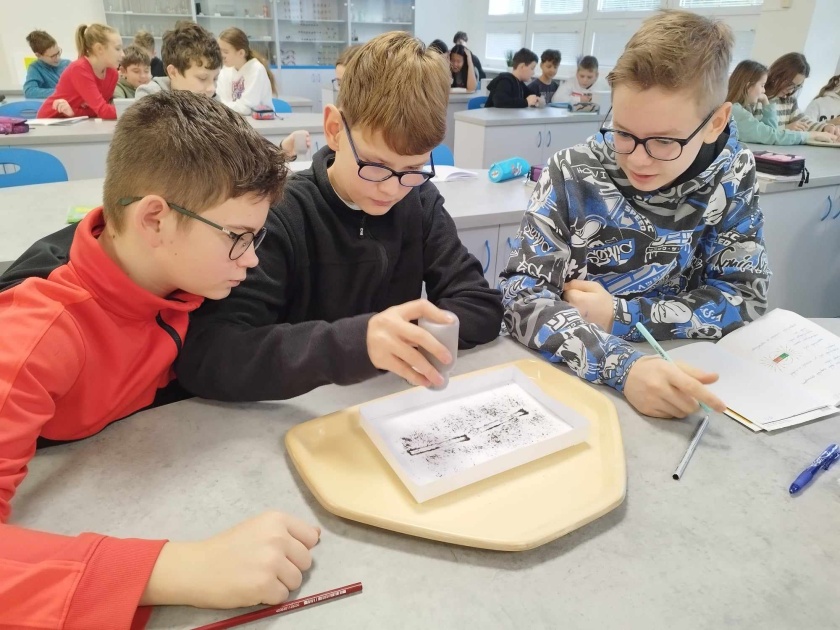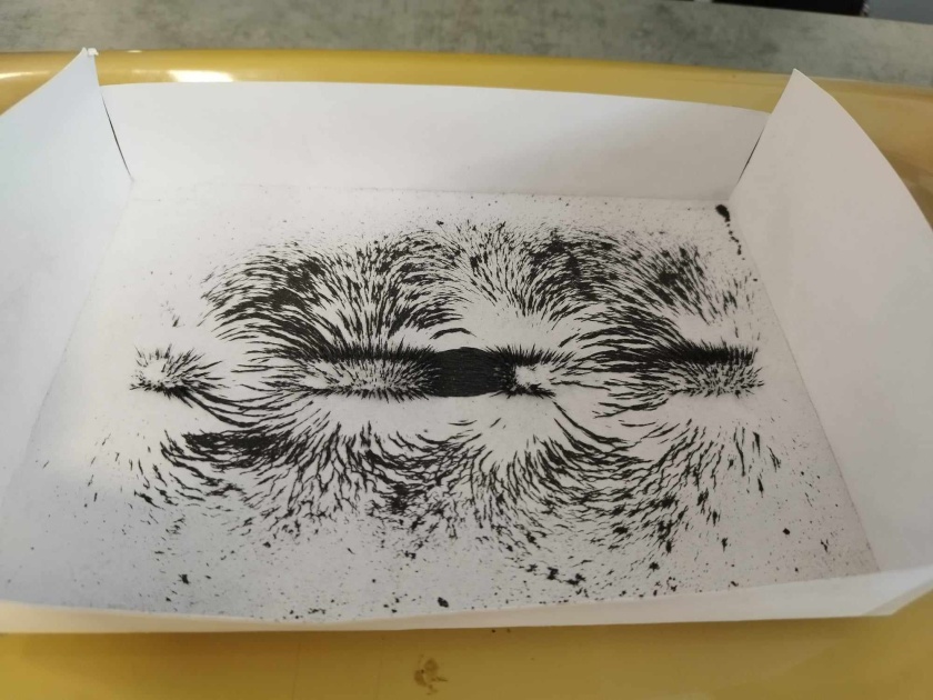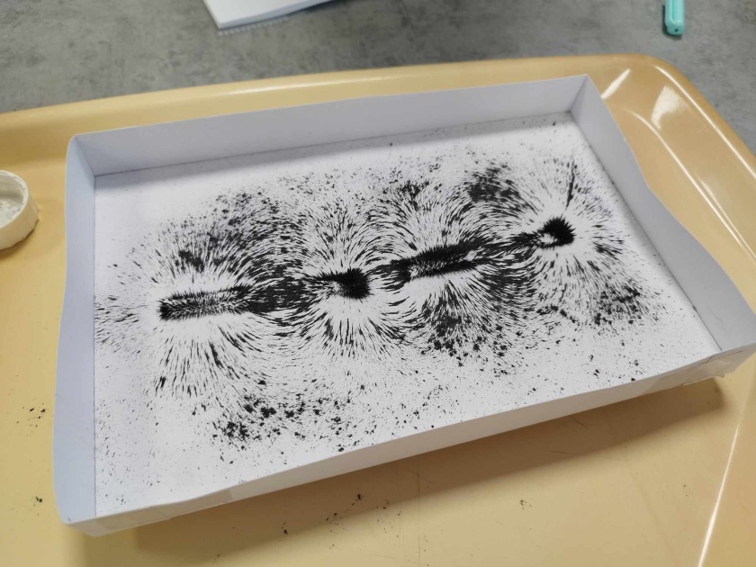 V šestém ročníku ve fyzice, jsme se rozhodli prozkoumat magnetické pole. Naprosto jednoduchý pokus, ale o to víc baví, když si ho osobně vyzkoušíte! Železné piliny, magnety, tác a papír. To jsou naše nástroje. Krásné obrazce, které nám vznikaly nás potěšili a zároveň ukázali, že magnetické pole si umíme nejen zobrazit, ale že ne vždy vypadá stejně! Záleží na pólech magnetu a kterými k sobě magnety směřují.