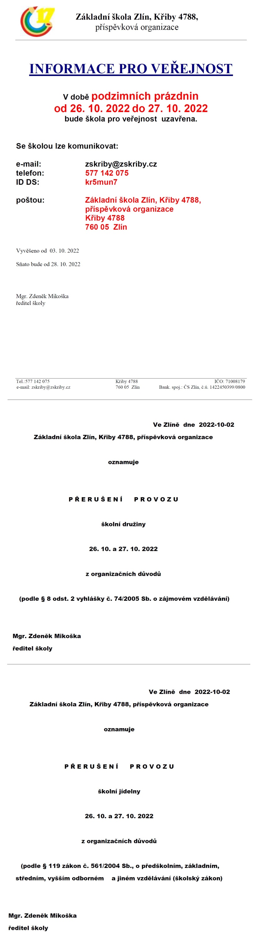 Informace pro veřejnost - podzimní prázdniny