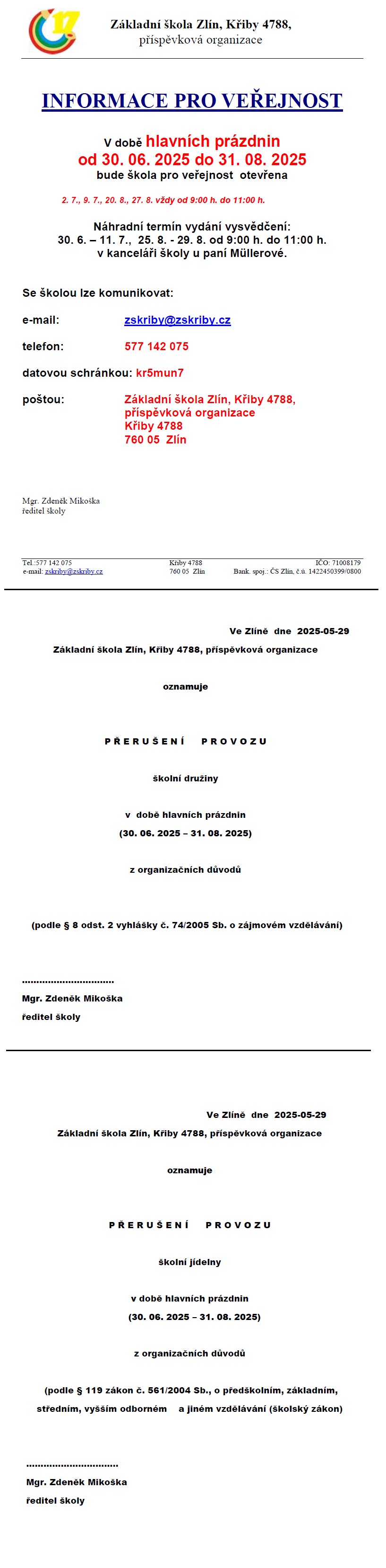 Informace pro veřejnost - prázdniny 2025