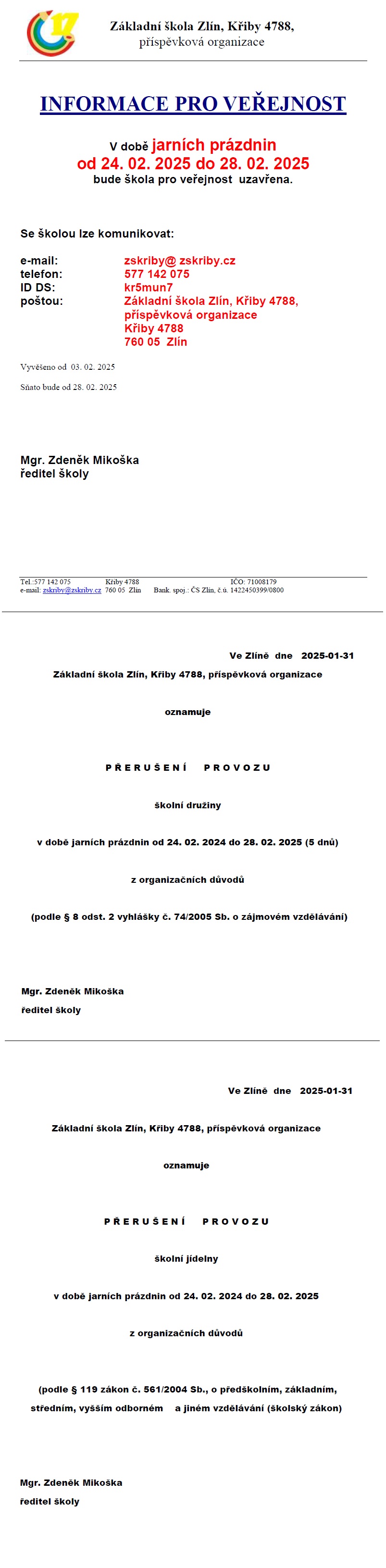 Jarní prázdniny - informace pro veřejnost