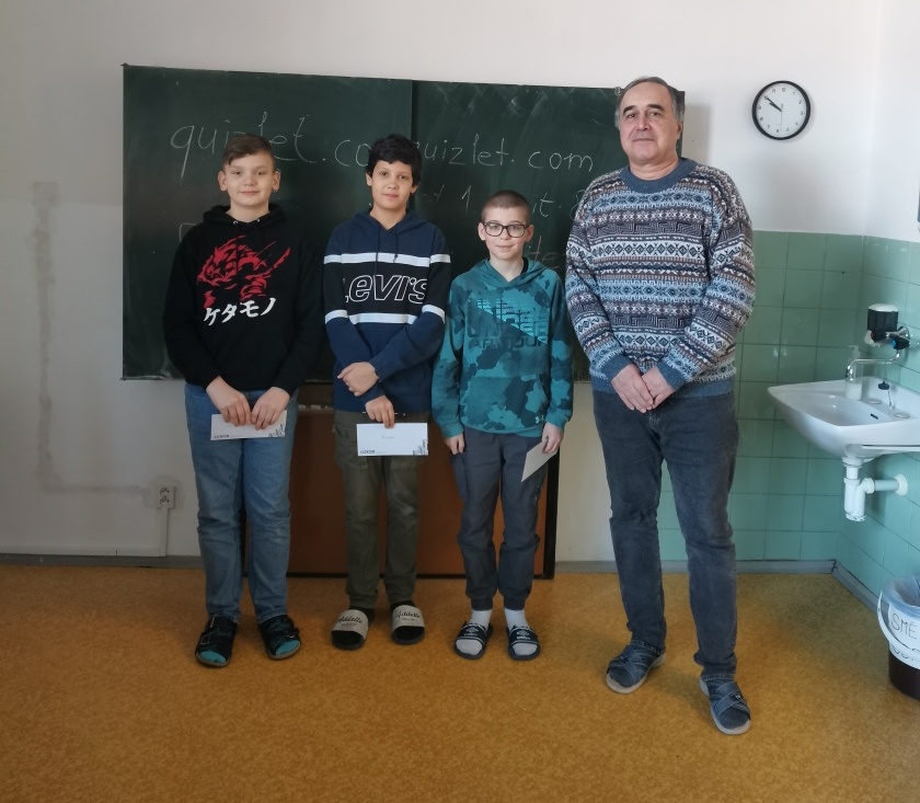 Minulý týden se uskutečnilo školní kolo konverzační soutěže v anglickém jazyce ve dvou kategoriích. I. kategorie pro žáky 6. a 7. ročníku, II. kategorie pro žáky 8. a 9. ročníku. Žáci měli za úkol hovořit na dané téma a popsat obrázek. V I. kategorii skončili na 3. místě Lukáš Konečný z 6.B a Jakub Vrtělka z 6.C. Na druhém místě se umístil Pavel Přikryl z 6.C a vítězem se stal Gabriel Mička z 6.A. Ve II. kategorii se na 3. místě umístil Filip Malina z 8.C a na velmi těsném 2. místě Míša Hájková z 9.B. Vítězkou se stala Leontýna Holíková z 8.A. Je vidět, že žáci jsou rok od roku lépe jazykově vybaveni. Ti nejlepší budou naši školu reprezentovat v okresním kole. Držíme palce!