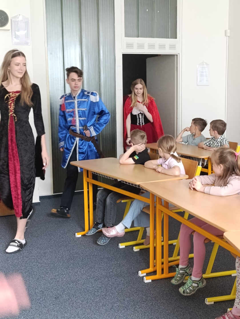 za starší spolužáky pohádková komise – rytíř (Petr Kučera), královna (Barbora Luňáková), Červená Karkulka (Valerie Nováková), hudba (Ondřej Malota) a fotografie (Natálie Pařenicová)