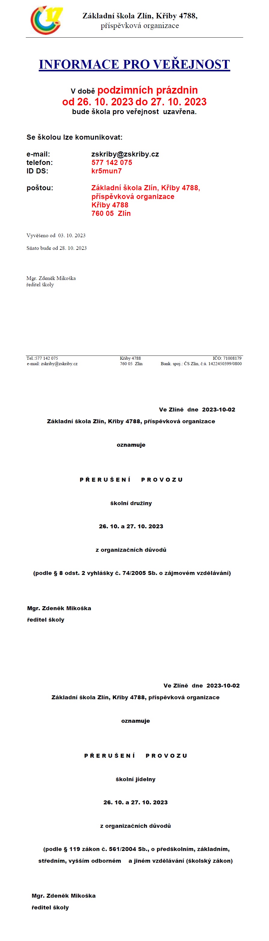Informace pro veřejnost -podzimní prázdniny