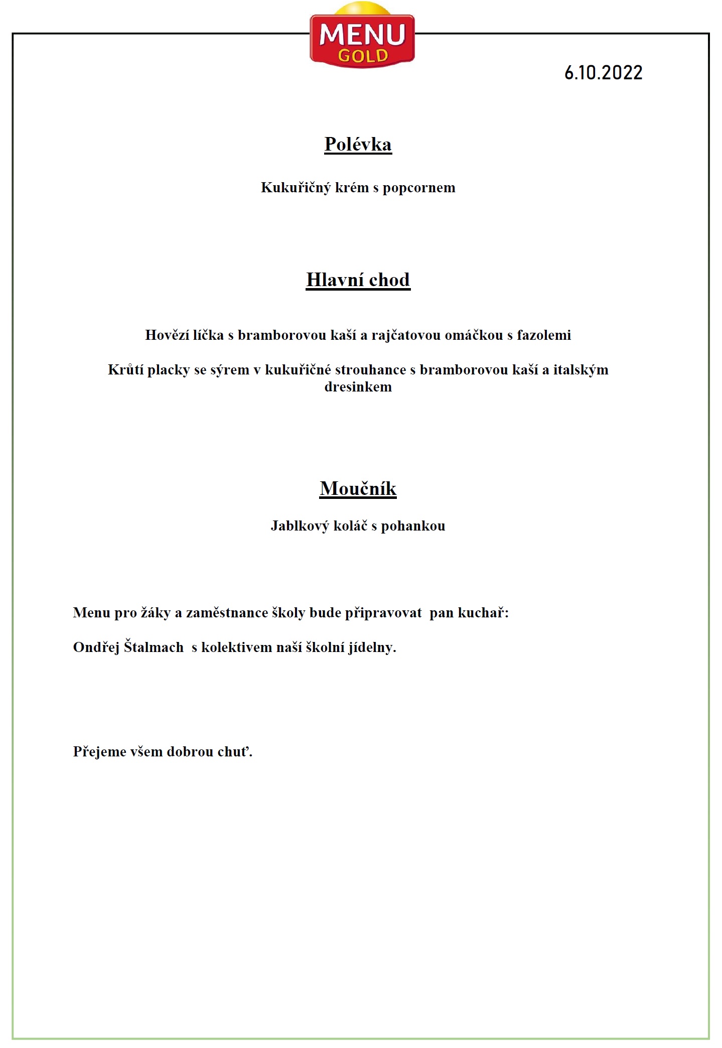 ve čtvrtek 6. 10. 2022 pro vás budeme připravovat tříchodové sváteční menu.