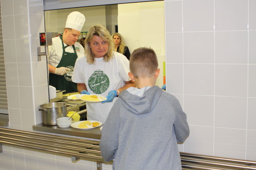 Žáci si tak mohli pochutnat na kukuřičném krému s popcornem, hovězích líčkách s bramborovou kaší, krůtích plackách se sýrem a italským dresingem a také na vynikajícím jablkovém koláči s pohankou.