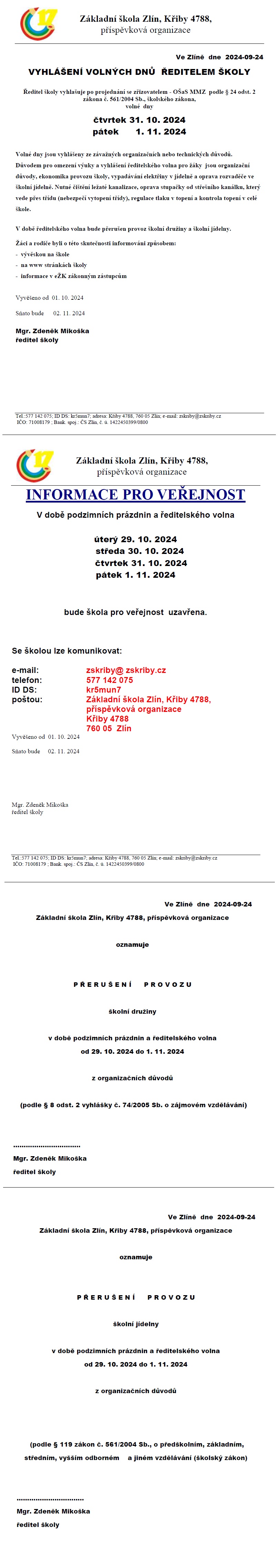 Vyhlášení volných dnů ředitelem školy
