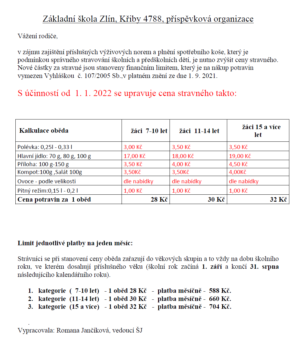 Úprava stravného od 1.1.2022